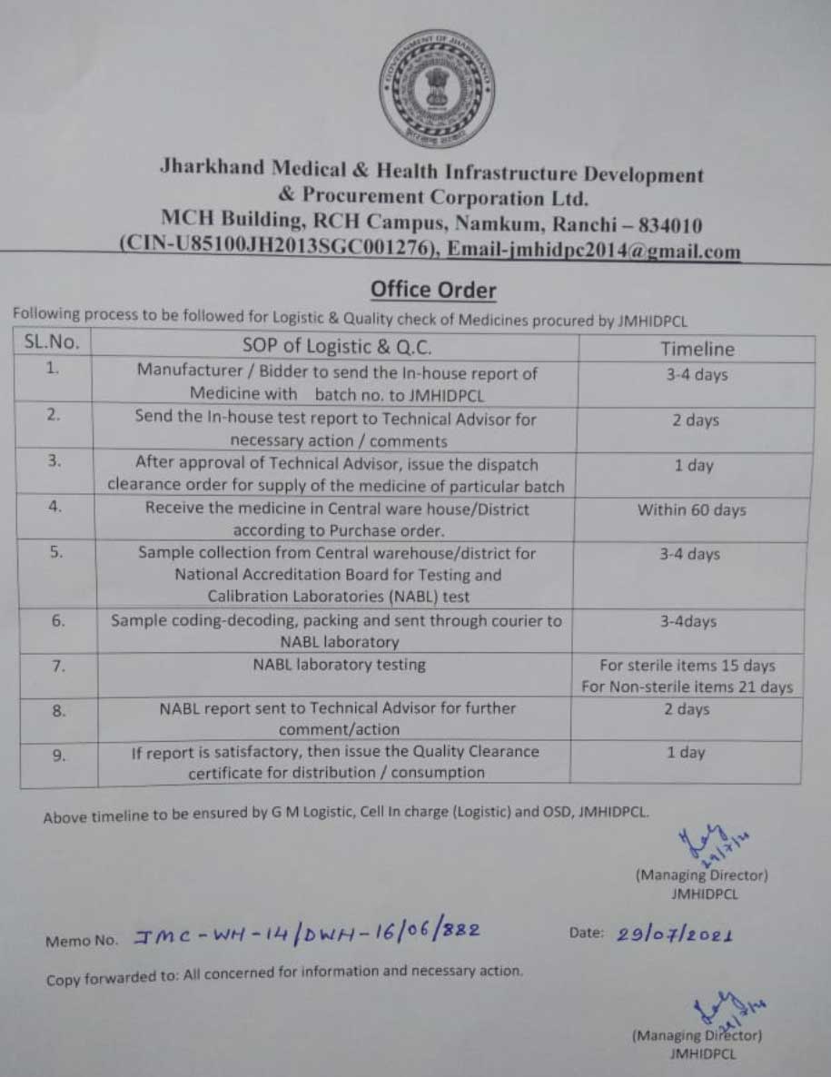 Jharkhand Medical and Health Infrastructure Development and Procurement Corporation Limited (JMHIDPCL) was established in 2013 at Ranchi Jharkhand, under the aegis of Department of Health, Medical Education and Family Welfare, Government of Jharkhand and was entrusted with the functions of procurement of medicines, surgical goods, medical equipment / instrument and others under Govt. of Jharkhand.(GoJ).